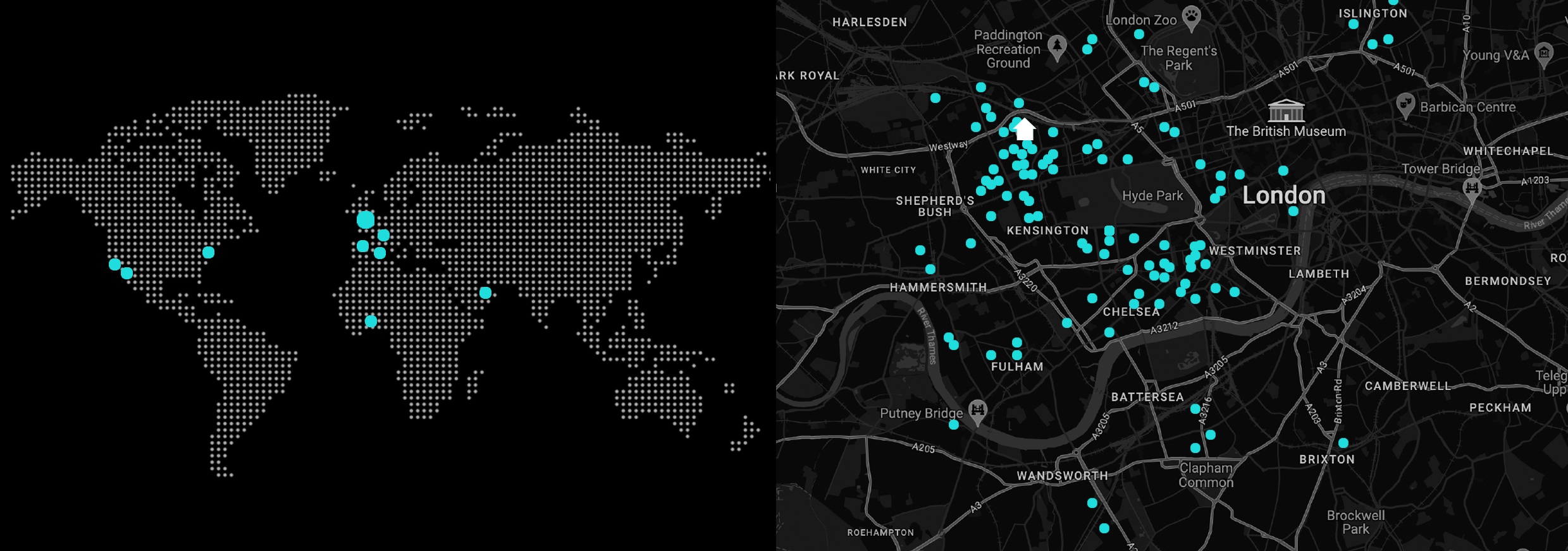 Maps showing locations in London, UK with blue dots indicating specific points of interest or data points.